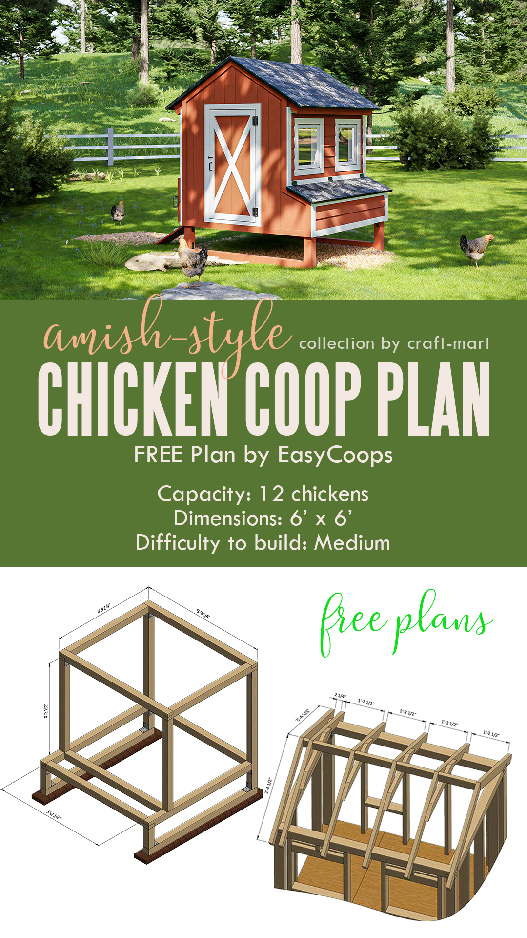 This small Amish-style coop offers a living space for 12 chickens with nesting boxes accessible from outside. As illustrated, the check-in coop design offers a secure living space raised off the ground, with a main door and a chicken-sized door with a ramp. It will easily fit in a small backyard or even suburban lot.