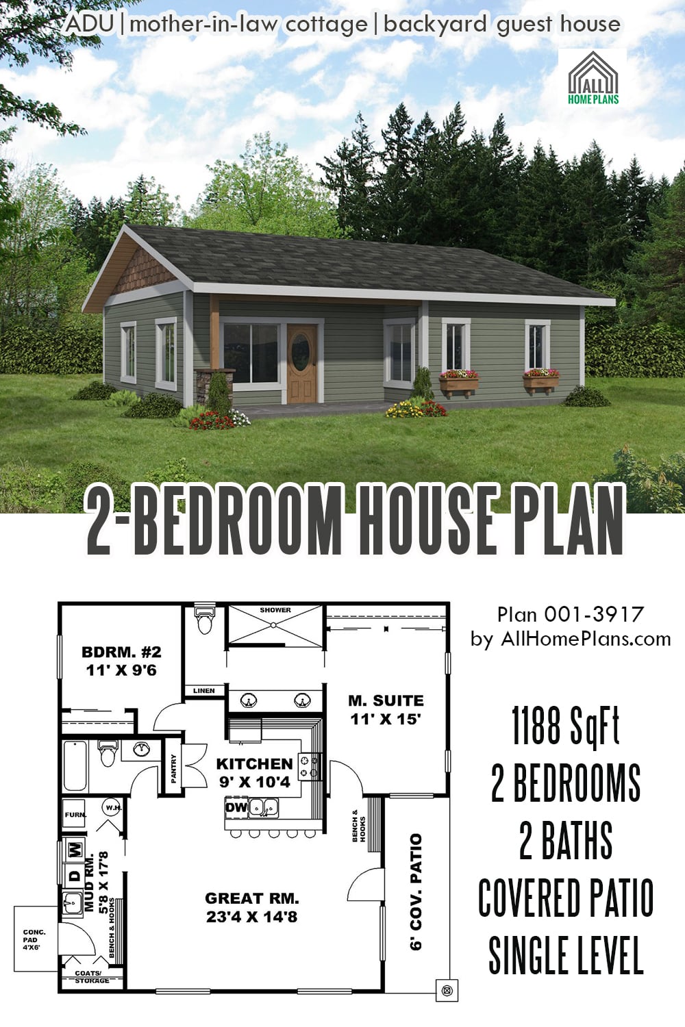 Look no further if you need to build a small 2-bedroom house and cut construction costs. With a simple roof line and compact floor plan, this design is a winner. Nevertheless, it offers plenty of contemporary design features as an open-concept great room, double sinks in the main suite, a mud room, and a covered patio.