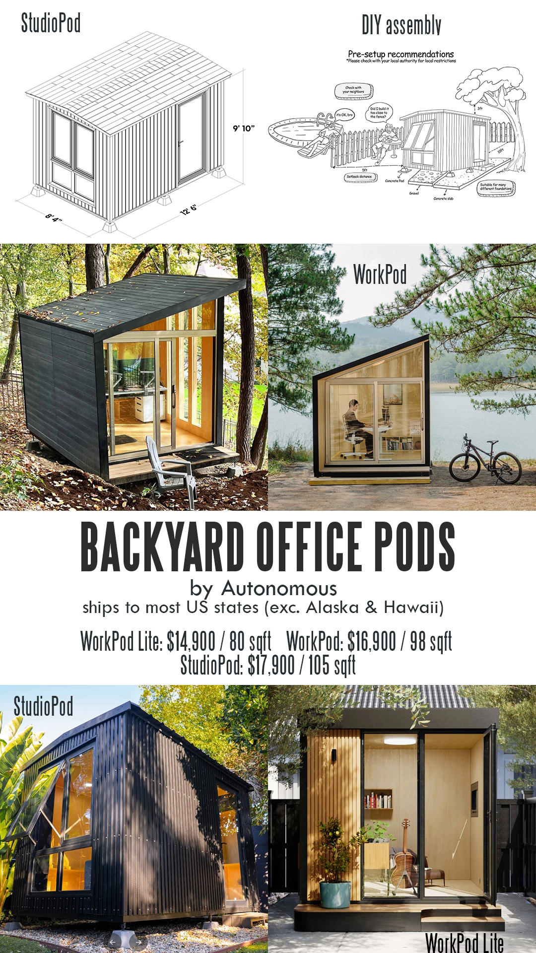 Check out WorkPod by Autonomous: Your Backyard Office Shed for Focus and Productivity. This innovative prefab solution to create a private office space doesn’t need a concrete slab and can be placed anywhere. Most importantly, it doesn’t matter what the terrain is – a WorkPod can be placed on any ground using concrete blocks.