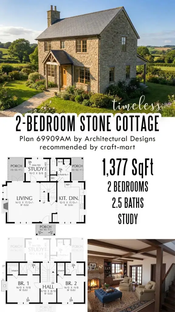 Another architectural style that gained popularity in recent years is timeless cottagecore. With a stone and timber exterior, exposed beams, and a cozy interior, this 1,300+ square feet timeless cottage is both charming and functional.
