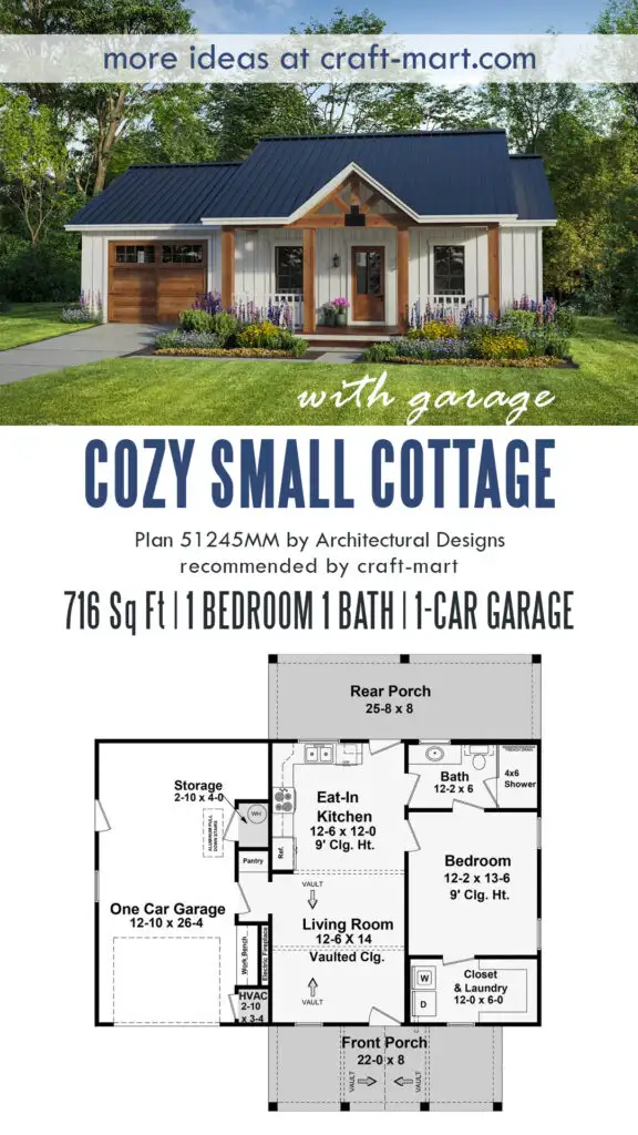 This charming cottage is a perfect example of a professionally designed floor plan, which combines simplicity with charm. Boasting 716 square feet of space on a single level, it offers 1 bedroom, 1 bath, and a 418 sqft 1-car garage with additional storage.