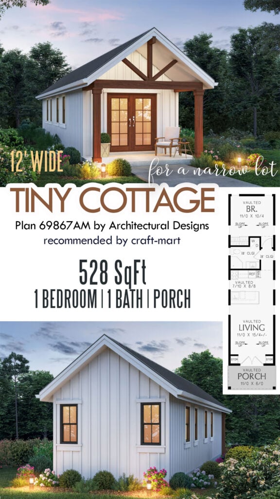 Looking for a compact yet comfortable living space? This petite 12-foot wide cottage is the answer, ideal for aging parents or a growing family seeking a multi-family setup on their land. Featuring a quaint porch, a cozy living room with a petite kitchen, a private bedroom, bathroom, and closet, this 528 sqft gem is a perfect ADU (accessory dwelling unit) plan to build a rental on your property.